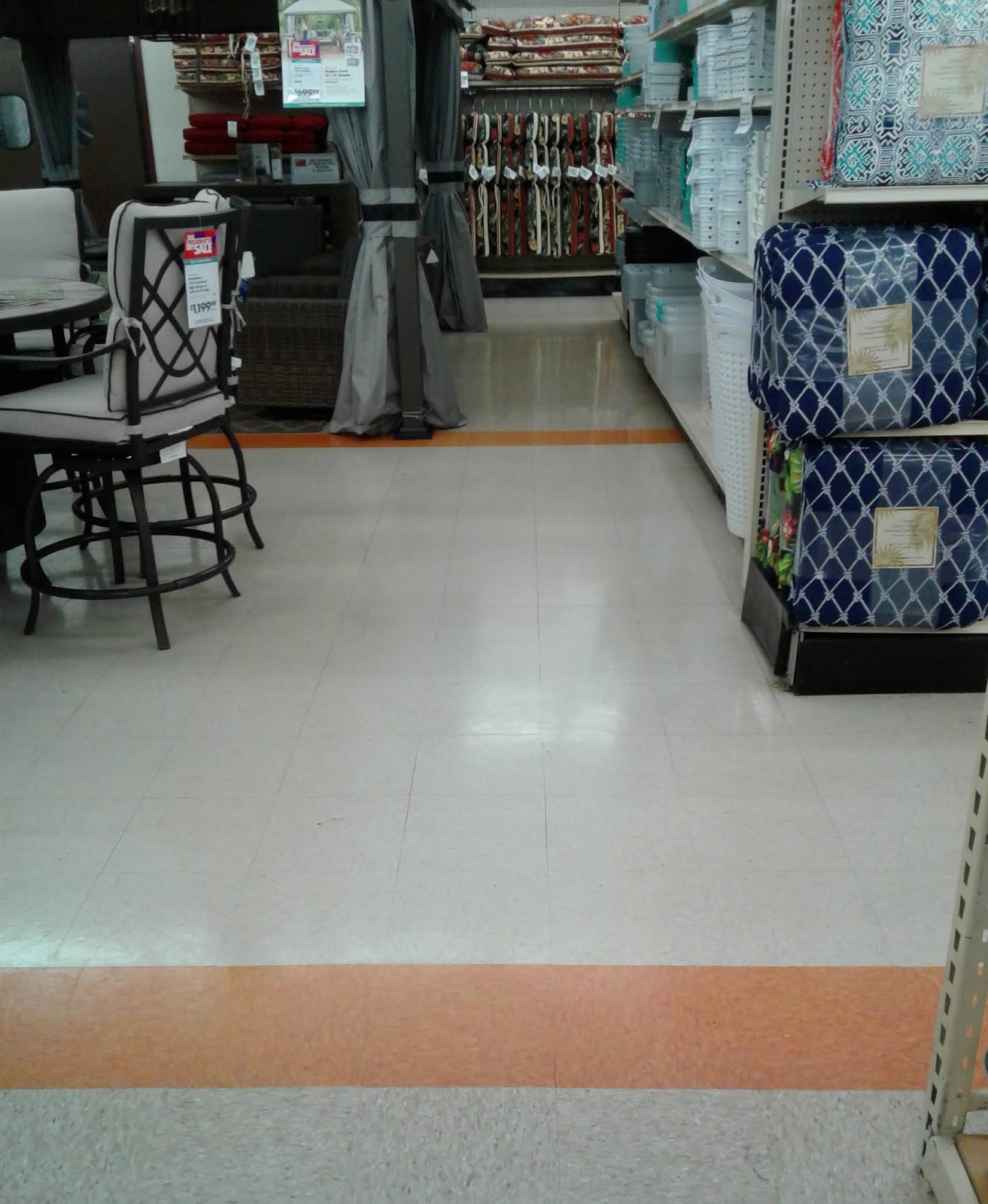 From seafood, here's a look across the back of the store where we see the transition from the wood-esque floors to the brown vinyl. However, we'll see more of this part of the store in a little bit, as I'm going to loop back through the far edge of the grand aisle before we press further into the left side of the building: