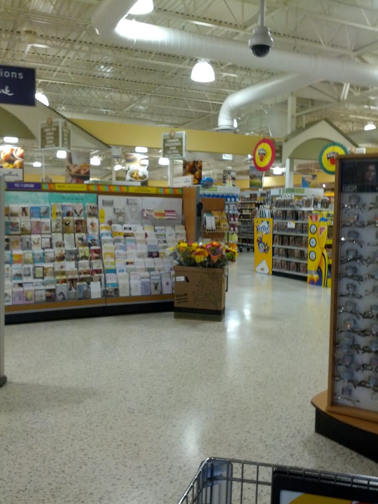 Stepping inside, the Entrance doors lead you to the pharmacy counter, located along the front wall. BOGO bins line the aisle in front of the pharmacy, with floral, the bakery, and the deli in the distance around the corner.
