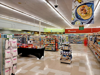Leaving the aisle, here's a look across the front of the store. While we see a lot about the building in this view, I can't stop thinking about how perfectly stocked that endcap of chicken broth is - it's flawless and symmetrical!
